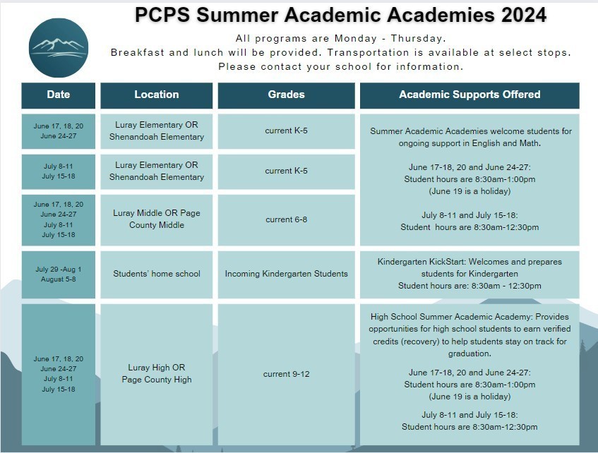 Page County Public Schools will be CLOSED on Monday, September 2, 2024, in observance of Labor Day. Please enjoy the long holiday weekend. School will resume on Tuesday, September 3, 2024.